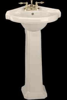 Hard to find Corner Sinks. Choose your Corner Sinks here today. Ideal for corner placement, our space-saving Portsmouth Bone Corner Pedestal Sink has a wall mount design with a pedestal added. Measures: 22" w x 32 3/4" h. Projects 20" from back corner. Backsplash 1" h. Bowl Measures: 11-1/2" w x 11" front to back. 6-1/2" bowl depth. Pedestal Measures: 25-1/2" h x 9-1/2" w. Takes a 4" centerset faucet. Manufacturer Logo will appear on lower sink edge. Order Your Portsmouth Bone Corner Pedestal Sink Now! Sorry, this item is Sold Out, and no longer available. Thanks!