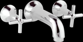 Classic Chrome on Brass Wall Mount Widespread Faucet measures 6 3/4 in. projection. Philadelphian-style cross handles. This faucet has a 500, 000 cycle cartridge for long-lasting life, and comes complete with pop-up drain assembly. Order Your Bright Chrome Plated Solid Brass Faucets Today! Sorry, this item is Sold Out, and no longer available. Thanks!