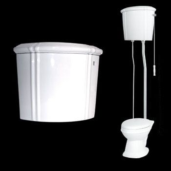 Our Stylish Victorian High Tank Pull Chain Toilet captures the grandeur and elegance of the past, while offering great performance. Features a hard fired ceramic tank, an attractive chrome supply line, and a Grade A Vitreous China Round Bowl. Ready to install with all mounting hardware, supply line & angle stop valve. Components have been updated with water-saving 1.6 gallon flush. Note: Seat not included. Total Height: Adjustable 74" - 78". Tank Measures: 18-1/4" wide x 10" deep. Tank height measures 16". Supply Line: 1/2". Adjustable 22" - 53". Tank Pipe: L-Style, 1 1/2" diameter. Adjustable 44" - 48" height. Bowl Measures: 15" w x 15" h. 15". Bowl Projection 25-1/2". Installed Projection: 26-1/2" - 29-1/2". Note: This item is in production. Timing for shipment has not been determined. Thanks! Obtain Your High Tank Victorian Toilets Here Today!