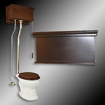 Our Stylish Victorian High Tank Pull Chain Toilet captures the grandeur and elegance of the past, while offering great performance. Features a Beautiful Dark Oak Wood Paneled Tank, an attractive PVD Brass supply line, and a Grade A White Vitreous China Round Bowl. Ready to install with all PVD Brass mounting hardware, supply line & angle stop valve. Components updated to water-saving 1.6 gallon flush. Note: Seat not included. Total Height: Adjustable 70" -74" Tank Measures: 23" wide x 10 1/2" deep. Tank height measures 15". Supply Line: 1/2"/adjustable 22"- 53-1/2". Tank Pipe: L-Style, 1 1/2" diameter x 49 1/4" high. Drain Pipe: Adjustable 44" - 48". Bowl Measures: 15" h x 15" w. Bowl Projection; 25-1/2" with adjustable 12" to 15" rough-in. Installed projection: 26-1/2" - 29-1/2". Obtain Your High Tank Victorian Toilets Here Today!