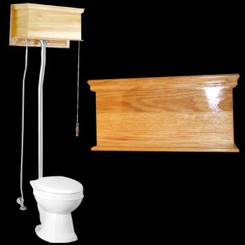 Our Stylish Victorian High Tank Pull Chain Toilet captures the grandeur and elegance of the past, while offering great performance. Features a Beautiful Light Oak Wood Paneled Tank, an attractive chrome supply line, and a Grade A Vitreous China Round Bowl. Ready to install with all mounting hardware, supply line & angle stop valve. Components updated to water-saving 1.6 gallon flush. Note: Seat not included. Total Height: Adjustable 70" -74" Tank Measures: 23" wide x 10 1/2" deep. Tank height measures 15". Supply Line: 1/2"/adjustable 22"- 53-1/2". Tank Pipe: L- Style, 1 1/2" diameter x 49 1/4" high. Drain Pipe: Adjustable 44" - 48". Bowl Measures: 15" h x 15" w. Bowl Projection; 25-1/2" with adjustable 12" to 15" rough-in. Installed Projection: 26-1/2" - 29-1/2". Obtain Your High Tank Victorian Toilets Here Today!