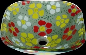 Glass Vessel Sinks: Our Sunflower Multi-Color Glass Square Washbowl measures 16 1/2 in. square x 6 in. deep x 1/2 in. thick double layer glass. Includes unique pop-up drain and gasket. Find the right faucet to complement your sink. See our wide selection of faucets. Glass Sinks. Order Your Sunflower Square Vessel Sink Today! Sorry, this item is Sold Out, and no longer available. Thanks!
