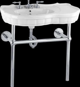 Our Bistro II White Console Sink weds a classic console with a sleek modern frame. This sink features Grade A vitreous china construction, self-draining soap dish, accommodating countertop & a sturdy Chrome Frame. Measures: 34 1/2" h x 35 3/8" w, with a 19-3/4 in. proj. Takes an 8" widespread faucet. Order Your Bistro II White Console Vitreous China Sink W/Chrome Frame Today! Sorry, this item is Sold Out, and no longer available. Thanks!