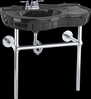 Our Bistro II Black Console Sink weds a classic console with a sleek modern frame. This sink features Grade A vitreous china construction, self-draining soap dish, accommodating countertop & a sturdy Chrome Frame. Measures: 34 1/2" h x 35 3/8" w, with a 19-3/4 in. proj. Takes a 4" centerspread faucet. Order Your Bistro II Black Console Vitreous China Sink W/Chrome Frame Today! Sorry, this item is Sold Out, and no longer available. Thanks!