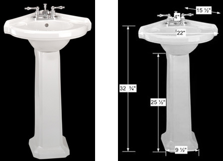 Hard to find Corner Sinks. Choose your Corner Sinks here today. Ideal for corner placement, our space-saving Portsmouth Corner Pedestal Sink has a wall mount design with a pedestal added. Measures: 22" w x 32 3/4" h. Projects 20" from back corner. Backsplash 1" h. Bowl Measures: 11-1/2" w x 11" front to back. 6-1/2" bowl depth. Pedestal Measures: 25-1/2" h x 9-1/2" w. Takes a 4" centerset faucet. Manufacturer Logo will appear on lower sink edge.