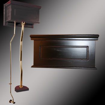 Our High Tank Z-Pipe Conversion Kit will transform your existing toilet bowl into a high tank! The materials and components use the latest 21st century technology. All tanks are a water-saving 1.6 gallons per flush. Ready to install with all mounting parts. Includes Dark Oak Finish raised panel wood tank, liner, supply line, mounting hardware. The flush pipe and supply lines are PVD Brass plated stainless steel for durability and lasting beauty. Measures: 23" w x 15" h. Projects 10-1/2".Drain Pipe: Adjustable 32" - 47". 1-1/2" diameter.Fill Pipe: Adjustable 22" - 53". 1/2" diameter tubing. Note: Toilet seat & bowl not included. Note: This item is in production. Timing for shipment has not been determined.