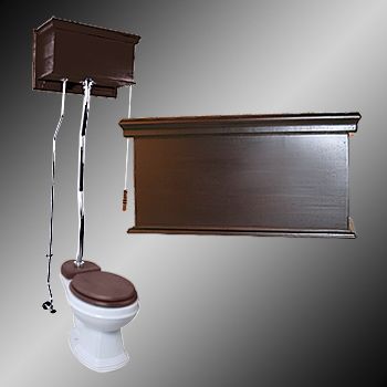 Our Stylish Victorian High Tank Pull Chain Toilet captures the grandeur and elegance of the past, while offering great performance. Features a Beautiful Dark Oak Finish Flat Panel Wood Tank Liner, an attractive Chrome supply line and fittings, and a Grade A Vitreous White China Round Bowl. Ready to install with all chrome mounting hardware, supply line & angle stop valve. Features water-saving 1.6 gallon flush. Note: Seat Not included. Total Height: Adjustable 59" - 74" Tank Measures: 23" wide x 10 1/2" deep. Tank height measures 15". Supply Line: 1/2" adjustable height 22" - 53.5". Tank Pipe: Z-Style, 1 1/2" diameter x adjustable 32" - 47" high. Bowl Height: 15" Bowl Width: 15" Bowl Projection: 28" with 12" rough-in. Order Your Victorian Pull Chain Toilet Today! Sorry, this item is in production. Timing for shipment has not yet been determined. Thanks!