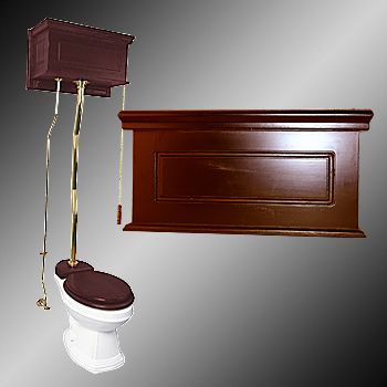 Our Stylish Victorian High Tank Pull Chain Toilet captures the grandeur and elegance of the past, while offering great performance. Features a Beautiful Dark Cherry Finish Wood Raised Panel Tank, an attractive PVD Brass supply line, and a Grade A White Vitreous China Elongated Bowl. Ready to install with all Brass mounting hardware, supply line & angle stop valve. Features water-saving 1.6 gallon flush. Note: Seat not included. Total Height: Adjustable 59" - 74" Tank Measures: 23" wide x 10" high x 10 1/2" projection. Supply Line: 1/2"/adjustable 22"- 53-1/2". Tank Pipe: Z-Style, 1 1/2" diameter x 49 1/4" high. Drain Pipe: Adjustable 32" - 47". Bowl Measures: 15" h x 14-3/4" w. Bowl Projection: 27-1/2" with 12" rough-in. Installed projection: 30". Obtain Your High Tank Victorian Toilets Here Today! Note: This item is in production. Timing for shipment has not been determined.