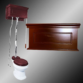 Our Stylish Victorian High Tank Pull Chain Toilet captures the grandeur and elegance of the past, while offering great performance. Features a Beautiful Dark Cherry Finish Raised Wood Paneled Tank, an attractive Chrome supply line, and a Grade A White Vitreous China Round Bowl. Ready to install with all Brass mounting hardware, supply line & angle stop valve. Components updated to water-saving 1.6 gallon flush. Note: Seat not included. Total Height: Adjustable 59" - 74" Tank Measures: 23" wide x 10" high x 10 1/2" projection. Supply Line: 1/2"/adjustable 22"- 53-1/2". Tank Pipe: Z-Style, 1 1/2" diameter x 49 1/4" high. Drain Pipe: Adjustable 32" - 47". Bowl Measures: 15" h x 15" w. Bowl Projection; 25-1/2" with 12" rough-in. Installed projection: 28". Obtain Your High Tank Victorian Toilets Here Today! Note: This item is in production. Timing for shipment has not been determined