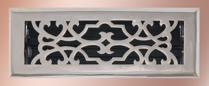 Our Victorian Design Floor Register In Solid Polished Brass boasts superior craftsmanship. Unlike the thin gage plated models found at cut rate retailers, these feature solid brass 3mm construction. The patented damper design allows the addition of hidden scented filters to reduce air pollution and keep homes smelling fresh. Augment the ambiance of your decor with these beautiful, functional faceplates. Measures: 3" x 10". Order Your Victorian Design Brass Floor Registers Today! Sorry, this item has been discontinued, and is no longer available. Thanks!