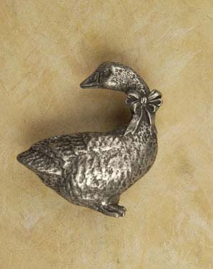 Our Whimsical Goose Cabinet Pull In Pewter (Left Facing) is eye catching and reflects a bit of personality in our Domestic farm animals. Perfect match for Farmhouse or Country home decor. Give your home or office a touch of country ambiance with our captivating cabinet hardware. Made of 100% Lead Free Pewter with Brass Finding on 3" centers. Measures: 4" wide x 3 1/2" high with a 3/4" projection. Preview Our Available Finishes Order Your Goose Cabinet Pulls Today!