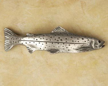 Our Convex Trout Pewter Cabinet Pull (Right Face) will ignite your passion for the wild, and instill in your home or office, the country ambiance of nature's wildlife and fishing streams. This pull will inspire reverence, in nature lovers and fishermen alike, for a fish that contributes much to our natural environment. Made from 100% Lead Free Pewter with Brass Finding on 3" centers. Measures: 4 1/2" wide x 1 1/4" high with a 1" projection Preview Our Available Finishes Order Your Convex Trout Pewter Cabinet Pulls Today!