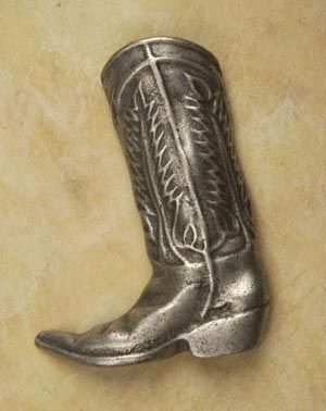 Our Large Boot Pewter Cabinet Knob (Left Face) will spur the imagination, and instill in your home or office, the wistful intrigue and romance of the Old West. This captivating pull will inspire reverence for a bygone era that is so much a part of our American Heritage. Made from 100% Lead Free Pewter with Brass Finding. Measures: 3 3/4" wide x 4 3/4" high with a 3/4" projection Preview Our Available Finishes Order Your Large Boot Pewter Cabinet Pulls Today!