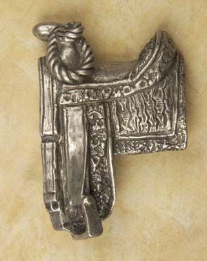 Our Western Saddle Pewter Cabinet Knob (Left Face) will spur the imagination, and instill in your home or office, the wistful intrigue and romance of the Old West. This captivating pull will inspire reverence for a bygone era that is so much a part of our American Heritage. Made from 100% Lead Free Pewter with Brass Finding on 3" centers. Measures: 3" wide x 4 3/4" high with a 1 1/4" projection Preview Our Available Finishes Order Your Western Saddle Pewter Cabinet Pulls Today!