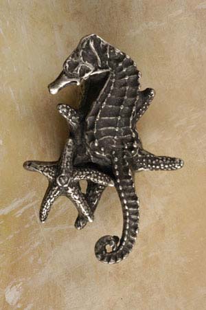 Our Seahorse Starfish Cluster Pewter Cabinet Knob (Left Facing) will kindle deep-seated reverance for creatures of the ocean, and instill fascination for the Sea's mysteries in your home or office. This maritime pull adds beauty, while creating an atmosphere of peaceful tranquility associated with the Sea and Nautical adventures. Made from 100% Lead Free Pewter with Brass Finding. Measures: 1 1/2" wide x 2 1/4" high with a 3/4" projection Preview Our Available Finishes Order Your Seahorse Starfish Cluster Pewter Cabinet Pulls Today!
