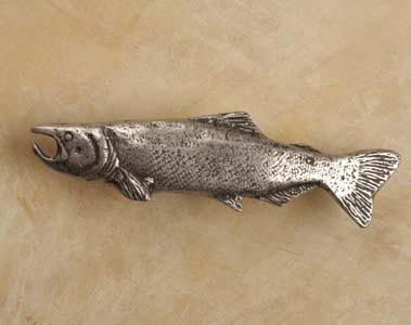 Our Salmon (Left Face) Pewter Cabinet Knob will ignite your passion for the wild, and instill in your home or office, the country ambiance of nature's wildlife and fishing streams. This pull will inspire reverence, in nature lovers and game sportsmen alike, for a fish that contributes much to our natural environment. Made from 100% Lead Free Pewter with Brass Finding. Single Post Mounting. Measures: 3 3/4" wide x 1" high with a 3/4" projection Preview Our Available Finishes Order Your Salmon Pewter Cabinet Pulls Today!