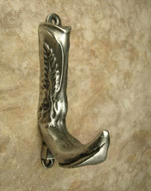 Our Western Boot Front, Decorative Pewter Hook will spur the imagination, and instill in your home or office, the wistful intrigue and romance of the Old West. This useful, captivating hook will inspire reverence for a bygone era that is so much a part of our American Heritage. Made from 100% Lead Free Pewter with Brass Finding. Measures: 1" wide x 5 1/2 high with a 2 1/4" projection. Preview Our Available Finishes Order Your Decorative Western Boot Front Hooks Today!