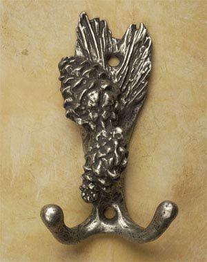 Our Double Pine Cone, Decorative Pewter Double Hook will cast a cheery glow to you home and surroundings. Instill a peaceful country atmosphere to your home or office. Let this useful, captivating Double Pine Cone Hook bring a bit of the great outdoors into your home. Made from 100% Lead Free Pewter with Brass Finding. Measures: 2 1/4" wide x 4" high with a 1 1/4" projection. Preview Our Available Finishes Order Your Decorative Double Pine Cone Hooks Today!