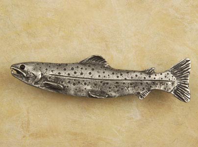 Our Large Trout (Left Face) Pewter Cabinet Knob will ignite your passion for the wild, and instill in your home or office, the country ambiance of nature's wildlife and fishing streams. This pull will inspire reverence, in nature lovers and fishermen alike, for a fish that contributes much to our natural environment. Made from 100% Lead Free Pewter with Brass Finding on 3" Centers. Measures: 5" wide x 1 1/4" high with a 1" projection Preview Our Available Finishes Order Your Large Concave Trout Pewter Cabinet Pulls Today!