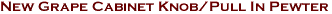 Our New Grape Cabinet Knob In Pewter will bring joy to your your senses, and make your home bloom with its own fruit orchard. This beautiful detailed pull will impress and inspire. Made from 100% Lead Free Pewter with Brass Finding. (Shown in Pewter W/Bronze Wash #132) Measures: 1 1/2" wide x 2" high with a 1" projection Preview Our Available Finishes Bring A Blooming Orchard Into Your Home Today With Our New Grape Cabinet knobs Today!