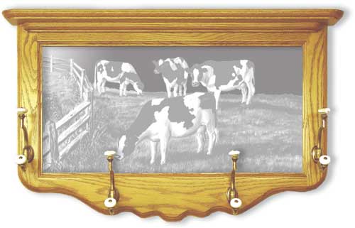 Our "Amazing Grace" Cows Etched Mirror Coat Rack by Randy McGovern is hand-selected for luster, framed in hand-rubbed oak hardwood, and is ready to hang. Reflect personality and image, while soothing the psyche with this functional artwork piece. Features four sturdy brass hangers with an antique brass finish and porcelain tips. Comes fully assembled. Measures: 30" w x 18" h. Order Your Solid Oak Framed "Amazing Grace" Cows Etched Mirror Coat RackToday!