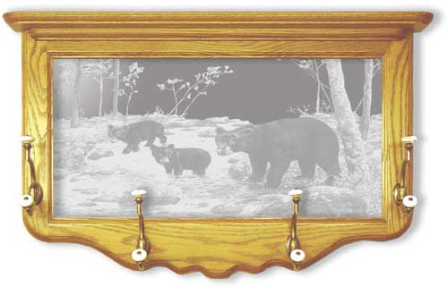 Our "Bear Feet In The Creek" Etched Mirror Coat Rack by Randy McGovern is hand-selected for luster, framed in hand-rubbed oak hardwood, and is ready to hang. Reflect personality and image, while soothing the psyche with this functional artwork piece. Features four sturdy brass hangers with an antique brass finish and porcelain tips. Comes fully assembled. Measures: 30" w x 18" h. Order Your Solid Oak Framed "Bear Feet In The Creek" Etched Mirror Coat RackToday!