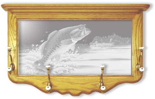 Our "Backwater Bass" Fish Etched Mirror Coat Rack by Geoff Hager is hand-selected for luster, framed in hand-rubbed oak hardwood, and is ready to hang. Reflect personality and image, while soothing the psyche with this functional artwork piece. Features four sturdy brass hangers with an antique brass finish and porcelain tips. Comes fully assembled. Measures: 30" w x 18" h. Order Your Solid Oak Framed "Backwater Bass" Fish Etched Mirror Coat RackToday!
