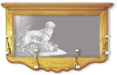 Our "Golden Retriever & Decoys" Etched Mirror Coat Rack by Linda Picken is hand-selected for luster, framed in hand-rubbed oak hardwood, and is ready to hang. Reflect personality and image, while soothing the psyche with this functional artwork piece. Features four sturdy brass hangers with an antique brass finish and porcelain tips. Comes fully assembled. Measures: 30" w x 18" h. Order Your Solid Oak Framed "Golden Retriever & Decoys" Dog Etched Mirror Coat RackToday!