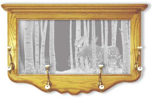 Our "On The Move" Moose Etched Mirror Coat Rack by Derk Hansen is hand-selected for luster, framed in hand-rubbed oak hardwood, and is ready to hang. Reflect personality and image, while soothing the psyche with this functional artwork piece. Features four sturdy brass hangers with an antique brass finish and porcelain tips. Comes fully assembled. Measures: 30" w x 18" h. Order Your Solid Oak Framed "On The Move" Moose Etched Mirror Coat RackToday!
