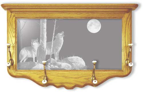Our "Rocky Outpost" Wolves Etched Mirror Coat Rack by Jim Hansel is hand-selected for luster, framed in hand-rubbed oak hardwood, and is ready to hang. Reflect personality and image, while soothing the psyche with this functional artwork piece. Features four sturdy brass hangers with an antique brass finish and porcelain tips. Comes fully assembled. Measures: 30" w x 18" h. Order Your Solid Oak Framed "Rocky Outpost" Wolves Etched Mirror Coat RackToday!