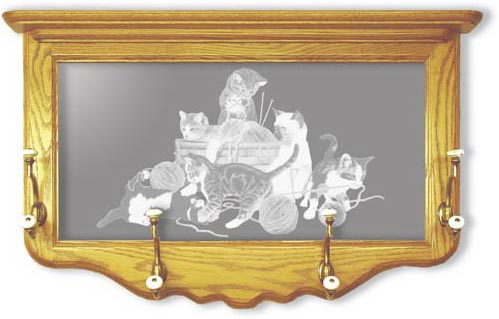 Our "Yarn Party Kittens" Etched Mirror Coat Rack by Linda Picken is hand-selected for luster, framed in hand-rubbed oak hardwood, and is ready to hang. Reflect personality and image, while soothing the psyche with this functional artwork piece. Features four sturdy brass hangers with an antique brass finish and porcelain tips. Comes fully assembled. Measures: 30" w x 18" h. Order Your Solid Oak Framed "Yarn Party Kittens" Etched Mirror Coat RackToday!