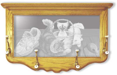Our "Peek A Boo Kittens" Etched Mirror Coat Rack by Mary Singer is hand-selected for luster, framed in hand-rubbed oak hardwood, and is ready to hang. Reflect personality and image, while soothing the psyche with this functional artwork piece. Features four sturdy brass hangers with an antique brass finish and porcelain tips. Comes fully assembled. Measures: 30" w x 18" h. Order Your Solid Oak Framed "Peek A Boo Kittens" Etched Mirror Coat RackToday!