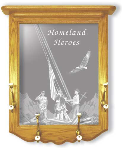 Our "Homeland Heroes" Firefighter Etched Mirror Coat Rack by Jon Baas is hand-selected for luster, framed in hand-rubbed oak hardwood, and is ready to hang. Pay tribute to our homeland heroes with this functional artwork piece. Features four sturdy brass hangers with an antique brass finish and porcelain tips. Comes fully assembled. Measures: 22" w x 26" h. Order Your Solid Oak Framed "Homeland Heroes" Firefighter Etched Mirror Coat RackToday! Sorry, this item is unavailable at this time. Thanks!
