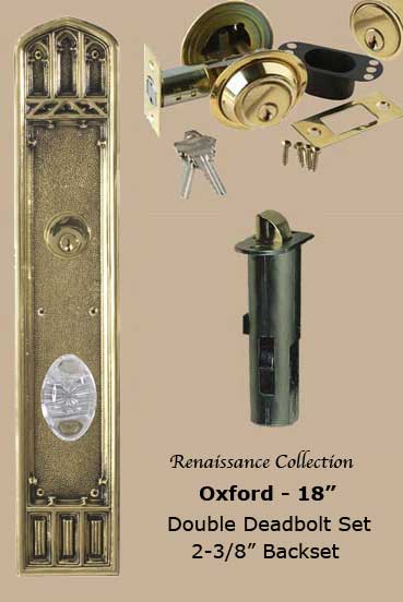 Our Oxford Series, 18" German Inspired Plate & Georgetown Crystal Knob, 2 3/8" Double Deadbolt Sets create Beautiful Door Hardware solutions for Home and Business. This faithful reproduction in the Belfort pattern of the Sargent & Co., circa 1894, allows match of these gothic plates with an assortment of knobs, levers, and finishes. Let your imagination soar, and create a look that is unique for you. Measures: 3-3/8" wide x 18" high. Entry Set: 5 1/2" Center to Center (Deadbolt). Bore: 2 1/8" Surface mount. Knob Diameter 2 1/4" with 2 5/8" Projection. Note: Double Deadbolt means Keyed on both sides. For Quick Reference of: What's Included? - Go Here. Order Your Brass Accents Door Hardware Today!