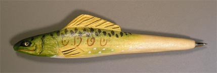 Our Carp Fish Handcarved Wood Pen is painstakenly handcarved, and painted by hand. Beautiful detailing enhances this unique aquatic theme pen. A satin clear coat finish has been applied to protect the detailing. Measures: 6-1/4" L Order Your Carp Fish Handcarved Wood Pen Today!