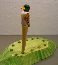Our Mallard Duck Handcarved Wood Pen is painstakenly handcarved, and painted by hand. Beautiful detailing enhances this unique wildlife theme pen. A satin clear coat finish has been applied to protect the detailing. Measures: 5-1/4" L Order Your Mallard Duck Handcarved Wood Pen Today!