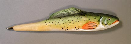 Our Rainbow Trout Handcarved Wood Pen is painstakenly handcarved, and painted by hand. Beautiful detailing enhances this unique wildlife theme pen. A satin clear coat finish has been applied to protect the detailing. Measures: 5-3/4" L Order Your Rainbow Trout Handcarved Wood Pen Today!