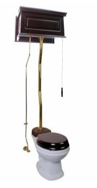 Our Stylish Victorian High Tank Pull Chain Toilet captures the grandeur and elegance of the past, while offering great performance. Features a Beautiful Dark Oak Finish Flat Wood Panel Tank, an attractive PVD Brass supply line, and a Grade A White Vitreous China Round Bowl. Ready to install with all Brass mounting hardware, supply line & angle stop valve. Features water-saving 1.6 gallon flush. Note: Seat not included. Total Height: Adjustable 59" - 74" Tank Measures: 23" wide x 10" high x 10 1/2" projection. Supply Line: 1/2"/adjustable 22"- 53-1/2". Tank Pipe: Z-Style, 1 1/2" diameter x 49 1/4" high. Drain Pipe: Adjustable 32" - 47". Bowl Measures: 15" h x 15" w. Bowl Projection: 25-1/2" with 12" rough-in. Installed projection: 28". Obtain Your High Tank Victorian Toilets Here Today! Note: This item is in production. Timing for shipment has not been determined.