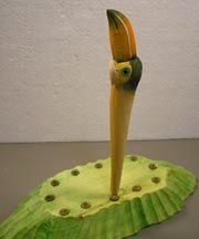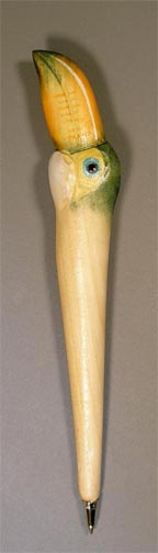 Our Toucan Head Handcarved Wood Pen is painstakenly handcarved, and painted by hand. Beautiful detailing enhances this unique tropical theme pen. A satin clear coat finish has been applied to protect the detailing. Measures: 6-1/4" L Order Your Toucan Head Handcarved Wood Pen Today!